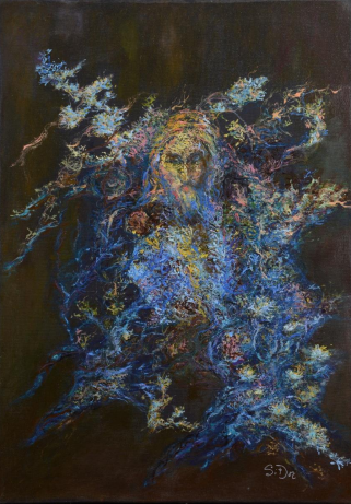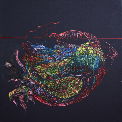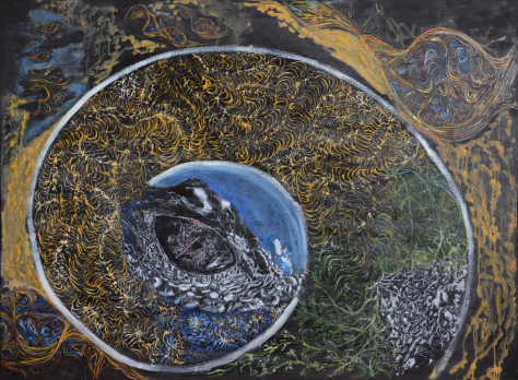 Aici, viața nu mai curge. Se închide. Se contractă în jurul unei prezențe care nu cedează: balaurul. Nu cel din povești, ci cel real — prezent în fiecare formă care înghite, care vrea să domine, care nu negociază. Dar în această lucrare, viața nu îl înfruntă. Îl înconjoară. Îl presează. Îl face să se încolăcească în el însuși. Îl forțează să devină centru, să se prăbușească spre sine. Este un act de echilibru, nu de victorie.Pentru că balaurul nu moare. Răul nu dispare.Doar este obligat să se resoarbă. Aceasta este o imagine a maturității vieții: nu ne mai hrănim cu iluzii. Știm că unele forțe nu pot fi distruse. Dar pot fi conținute. Reduse. Făcute să se întoarcă în locul din care au venit. În acest tablou, balaurul nu mai devorează lumea. Dar nici lumea nu-l alungă. Îl ține acolo — în mijlocul ei. Ca pe o rană care a învățat să nu mai sângereze.