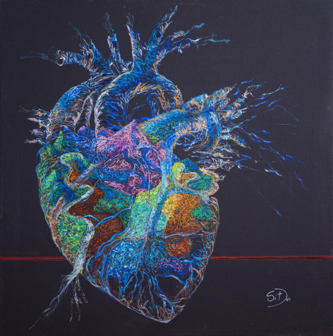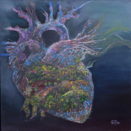 Această inimă nu este una obișnuită. Din ramificațiile ei mov – culoare a regalității și a misterului – pulsează o energie veche, aproape sacră, care nu se oprește în granițele cărnii. Înăuntru, verdele a erupt, un peisaj viu care nu mai poate fi conținut. E o inimă care nu mai bate doar pentru ea, ci curge în afară, se transformă în peisaj, în drum, în călătorie. Movul nu e doar o amintire de sânge albastru, ci poate chiar forța care a împins această inimă spre deschidere, spre revărsare. Ceva din noblețea tăcută a începuturilor s-a topit în curajul de a deveni altceva. De a renunța la închidere pentru a permite vieții să iasă, să respire, să atingă. „Inima Călătorului” este o inimă care nu aparține nici unui trup. Este un organ al drumului, al abandonului, al transcendenței. În ea, misterul și natura nu se opun, ci creează împreună o ființă nouă: una care nu mai caută locul din care vine, ci direcția în care poate înflori.