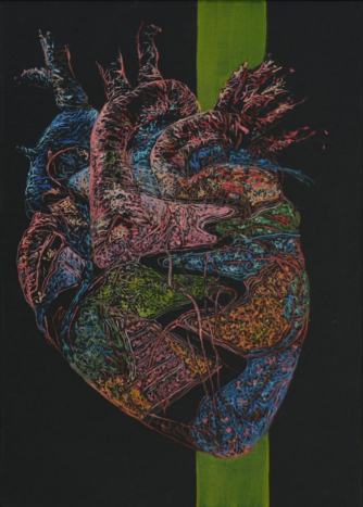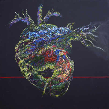 Aceasta nu este o inimă. Este o pădure electrică, un teritoriu viu, în care s-au intersectat prea multe drumuri. Dar printre toate ramificațiile, printre toate strălucirile organice, rămâne una — o cărare — care nu doar traversează, ci sfâșie. Ea nu este evidențiată prin culoare, ci prin absență. E golul care a rămas în urzeală. Și de aceea e cel mai viu. Această inimă nu bate pentru că a fost atinsă. Bate pentru că a fost străpunsă. Pentru că a trebuit să se refacă în jurul golului. Și pentru că, uneori, viața nu curge prin vene, ci prin ceea ce a lipsit. Un manifest tăcut despre iubire, despre rănire, despre reconstrucție. Despre frumusețea lucrurilor care au fost traversate și au rămas întregi — dar nu la fel