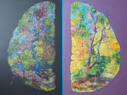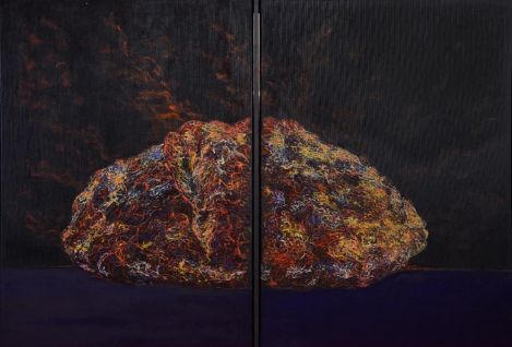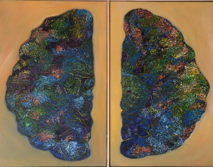 Două emisfere. Două lumi. Una se închide în sine, în filamente strânse, în gânduri care se răsucesc asupra lor însele ca niște rădăcini în lut. Cealaltă se deschide, se luminează, devine aproape permeabilă — ca un câmp după ploaie. Dar nu e o luptă. E un pact. Această lucrare nu vorbește despre dualitate, ci despre întreg. Despre cum viața cuprinde și densitatea și transparența. Și cum gândirea adevărată se naște nu din claritate, ci din tensiunea dintre cele două. În tăcerea dintre panouri, poate auzi întrebarea nerostită: „Care dintre cele două ești tu acum?”