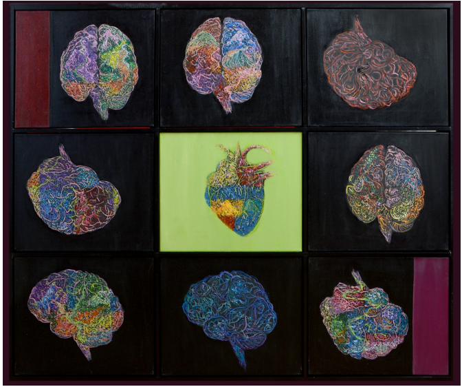 Această compoziție nu este o colecție de imagini diferite, ci o singură întrebare reluată obsesiv din unghiuri ușor deplasate. Creierul apare fragmentat, rotit, comprimat, uneori aproape dizolvat, alteori excesiv de încărcat, ca și cum aceeași structură ar fi forțată să răspundă la contexte incompatibile. Fiecare cadru este o ipostază a adaptării: aceeași arhitectură internă, supusă unor presiuni diferite, cromatice și tensionale. Ordinea geometrică a ansamblului (grila) contrastează cu imposibilitatea internă de a rămâne coerent. În interiorul fiecărei „celule” vizuale, liniile se încurcă, culorile negociază spațiul, iar forma finală nu este niciodată definitivă. Este o serie despre repetare fără stabilizare. Apariția inimii, izolată pe un fundal verde, nu aduce reconciliere, ci o mutare a conflictului. Nu este opusul creierului, ci o altă formă de organizare a aceleiași tensiuni. Dacă creierul luptă cu fragmentarea și supraîncărcarea, inima luptă cu expunerea: este pusă în centru, scoasă din negru, dar rămâne la fel de vulnerabilă, la fel de stratificată. Împreună, aceste imagini vorbesc despre imposibilitatea unei sinteze finale. Nu există un „creier corect”, nici o „inimă pură”, ci doar variații funcționale ale aceluiași efort de a rămâne întreg într-o lume care cere simultan claritate, viteză, emoție și control. Seria nu caută soluții; documentează uzura. Și tocmai în această uzură repetată apare, paradoxal, o formă de continuitate — nu ca armonie, ci ca supraviețuire.