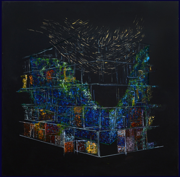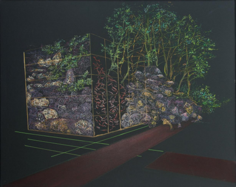 Inițial, privirea este condusă de liniile clare, de cubul perfect închis, de direcțiile precise ale unui spațiu desenat de mintea umană. Totul pare calculat, limitat, dirijat spre un ideal geometric. Dar în interiorul acestor margini, viața începe să se strecoare, mai întâi timid, apoi inevitabil – până când pereții se fisurează, iar natura își recapătă locul. Este o scenă a resemnării fertile. Nu o înfrângere, ci o întoarcere. Viața nu opune rezistență, ci așteaptă. Știe că fiecare creație a omului, oricât de rigidă, poartă în ea o sămânță uitată. Iar când forma obosește, când măsurătoarea devine insuficientă, din structurile noastre iese, cuminte și fermă, tot ce am exclus: seva, rădăcina, răsuflarea. „Reintegrare” nu este despre salvare, ci despre inevitabil. Nu putem fi în afara vieții fără să devenim sterili. Când renunțăm la margini, chiar și pentru o clipă, ne amintim că nu suntem doar constructori de forme, ci fragmente de pădure, rădăcini rătăcite, visând întoarcerea.