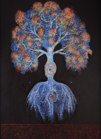 Aceasta nu este o metaforă. Este anatomia vieții în forma ei verticalizată. Un arbore sefirotic în care nu mai știm unde începe ființa și unde începe cosmosul. Trunchiul este o coloană vertebrală. Rădăcinile – un sistem circulator. Frunzișul – o rețea neuronală în flăcări albastre. Iar în centru, acolo unde în unele tradiții stă inima, aici stă un nod viu de tensiune — început și sfârșit în același timp. Această lucrare nu propune un simbol. Propune o revelație: Viața nu e orizontală. Nu e întâmplătoare. Se organizează. Se înalță. Se concentrează în noduri, în centri, în emisii. Este un arbore în care omul e ramură și rădăcină în același timp. Un om care, în sfârșit, a înțeles că viața nu-i aparține — dar că el poate deveni o formă prin care viața se exprimă.