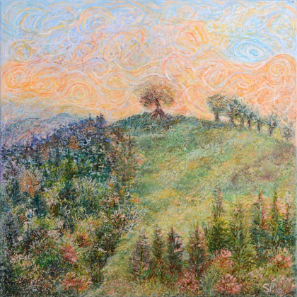 Pe această culme nu e doar lumină. E structură. Un copac singur, dar vertical, iar în urma lui — o linie de făpturi tăcute, de arbori aleși, care nu se pierd în mulțime, ci dau direcție. Această pictură vorbește despre cei puțini. Despre cei care, prin forma lor, prin rigoarea prezenței, pot conduce fără a impune. Ei nu domină. Nu se confundă. Nu cedează în fața amestecului. Sunt purtători ai unei tensiuni curate — una care nu vine doar din pământ, ci și din cer. Cerul însuși, cu vârtejurile sale moi, le înconjoară spatele. Le dă susținere. Iar în urma lor, peisajul — amestecat, divers, uneori haotic — își găsește totuși un sens, o coloană, o posibilitate de urcare. Aceasta este imaginea discreției care ordonează. A stricteții care nu distruge, ci ține.