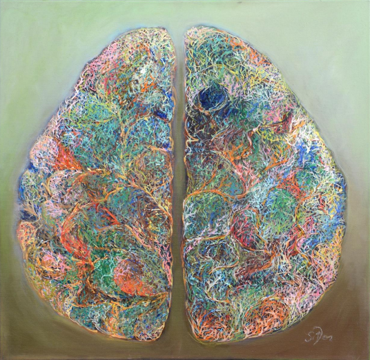 Aici nu este o luptă între emisfere. Este o conversație tăcută. Cele două părți ale acestui creier sunt două fețe ale vieții: una e curgere și intuiție, cealaltă e contur și structură. Una respiră prin sentiment, cealaltă prin raționament. Și totuși, se privesc. În această lucrare, femininul și masculinul nu sunt opuse. Sunt acordate. Se sfătuiesc, nu se anulează. Se observă fără să se grăbească să se înțeleagă. Între ele nu e un conflict. E un spațiu de liniște. Acolo locuiește gândul. Poate tocmai de aceea mintea adevărată nu e nici logică, nici emoție. E întâlnirea dintre ele