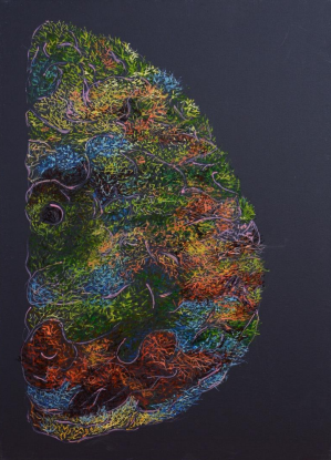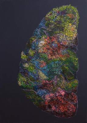 Aici e creierul pe care nu-l poți diseca. Pentru că nu e un organ, ci o pădure vie, o țesătură din ramuri care nu încetează niciodată să crească. Nu mai e vorba de emisfere, de știință sau de mister — ci de vibrații, de culori care nu se ating niciodată de-a binelea, dar care se caută întruna, în adânc. Aceasta nu este reprezentarea minții. Este urzeala gândului înainte de a fi rostit. Aici, fiecare nuanță e o nervură a incertitudinii, iar fiecare sinapsă o ramură de coral care refuză simetria. Oare pe unde o trece de data asta Gândul? Pe unde vrea. Sau pe unde e lăsat. Dar nu uita: ce vezi e doar urma lui. Gândul adevărat nu rămâne niciodată în urmă.