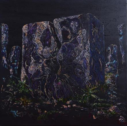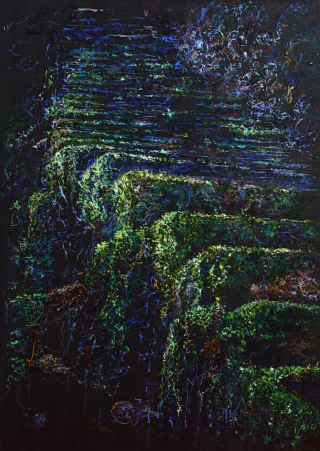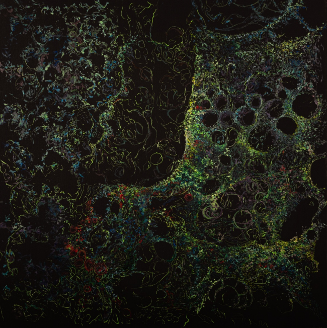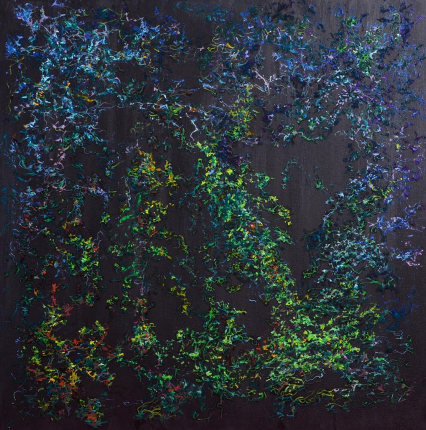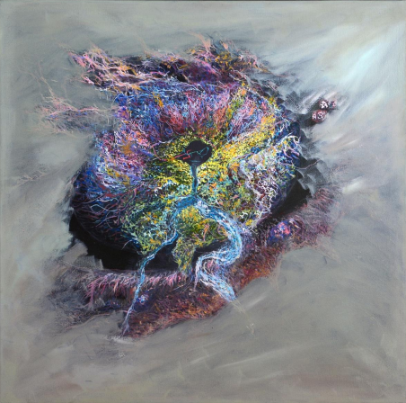 Aici nu mai e corp. Nici formă. Nici centru. Doar viață. În stare pură. În expansiune. Această lucrare nu se poate înțelege, doar simți. Este ceea ce rămâne dintr-un suflu primordial care nu s-a oprit niciodată. Culorile nu se organizează, nu formează un tipar. Se răspândesc. Se caută.Se multiplică. Este viața înainte de a se fi hotărât ce fel de viață vrea să fie. Pe fundalul întunecat, aproape cosmic, apar semnele discrete ale deveniri: verdele crud al începuturilor, albastrul incert al direcției, galbenul tensiunii vii. Aici nu există un "unde". Doar un încotro. Și o singură certitudine: viața nu se oprește. Se extinde.