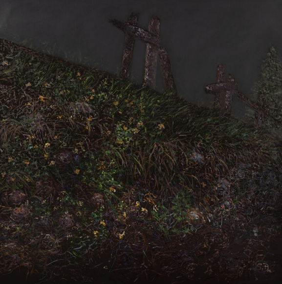 Terenul înclinat al vieții Nu e un cimitir. Nu e o metaforă. E o colină în care viața urcă oblic, străbătând urmele a ceea ce a fost. Crucile nu sunt centrale. Sunt rămășițe — semne ale unui sfârșit care nu a reușit să oprească nimic. Pentru că viața, aici, nu plânge. Crește. Răsare din iarbă, din umbră, din pământul greu. Florile mici, fragile, par aproape neînsemnate. Dar ele sunt dovada tăcută că tot ceea ce pare sfârșit devine humus. Această lucrare nu spune că moartea nu există. Ci că ea nu e ultimul cuvânt. Și că orice construcție — oricât de solemnă, de verticală, de sacră — va fi, în timp, reîntoarsă în ciclu. Pentru că viața nu respectă liniile. Nici crucile. Ci doar vibrația care continuă. Și în continuarea aceea stă tot sensul.