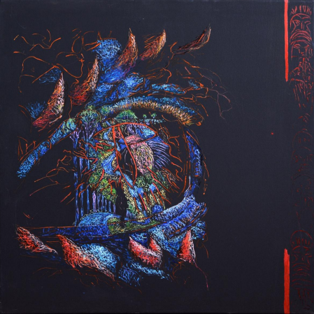 Aceasta nu este o retină. Nu este nici măcar un organ. Este un centru de emisie. O fântână vie în care se adună toate culorile realității, pentru a se revărsa înapoi în lume sub forma privirii. Privirea acestui ochi nu e direcționată, nu caută, nu selectează. Ea creează .Dinspre nucleul întunecat — o formă vegetală, pulsatorie, aproape inimă — pornesc curgeri de lumină, culoare, nervi, rădăcini, vibrații. Totul pare născut dintr-un singur impuls: să se întâmple lumea. Și lumea se întâmplă. Se desfășoară spiralic, radiant, fractalic, în jurul acestei priviri care nu are pleoape. Pentru că nu obosește. Nu închide. Nu se teme. Acesta este un ochi care nu mai observă. Ci oglindește devenirea.