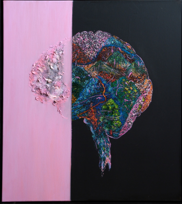 Acest tablou vorbește despre o despărțire care nu este violentă, ci aparent calmă: linia dreaptă dintre roz și negru. O limită curată, aproape administrativă, trasată peste ceva ce, prin natura lui, nu poate fi separat fără pierdere. În stânga, materia este moale, estompată, aproape decorativă — o suprafață liniștitoare, acceptabilă, ușor de consumat. Este forma sub care ne prezentăm lumii: simplificată, igienizată, tradusă în culori suportabile. În dreapta, însă, apare interiorul: dens, contradictoriu, stratificat, imposibil de redus la o singură narațiune. Creierul nu este reprezentat ca organ, ci ca teritoriu — un relief viu, traversat de tensiuni, rute, acumulări și abandonuri. Ruptura dintre cele două nu este doar estetică, ci existențială. Ea vorbește despre imposibilitatea de a ne traduce integral în exterior fără a ne trăda. Ceea ce rămâne dincolo de linie — textura brută, culorile care se amestecă fără ordine, coborârea spre ceva aproape organic — este ceea ce nu poate fi comunicat fără pierdere. Tabloul nu acuză această separare, dar nici nu o justifică. O constată. Arată prețul adaptării: pentru a fi acceptați, trebuie să tăiem din noi; pentru a rămâne întregi, trebuie să acceptăm că o parte va rămâne mereu invizibilă. Între rozul liniștitor și negrul adânc nu există reconciliere deplină — doar tensiunea continuă care ne ține funcționali. Exact ca în viață.