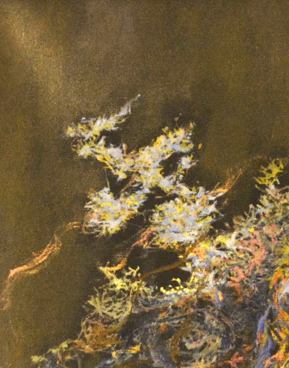Un chip cristic se conturează încet, ca o revelație tăcută, ascuns în inima unei vegetatii dense și tenebroase. Între rădăcinile încâlcite și lianele ce atârnă ca niște brațe uitate de timp, trăsăturile feței sale se ivesc subtil, sculptate în umbre și lumini filtrate prin frunzișul întunecat. Ochii, adânci ca o taină, par să absoarbă toată suferința lumii, dar și o blândețe infinită, ascunsă în privirea lor tăcută. Fruntea poartă urmele unei înțelepciuni care transcende timpul. Pe alocuri, vegetația se retrage, lăsând să pătrundă firave raze de lumină, ca niște atingeri divine ce mângâie conturul feței, dezvăluindu-i pentru o clipă expresia solemnă. În liniștea stranie a acestui loc, parcă se aude o șoaptă: chemarea unui adevăr ascuns, pe care doar cei care privesc dincolo de imagine o pot auzi.